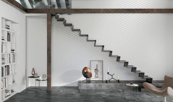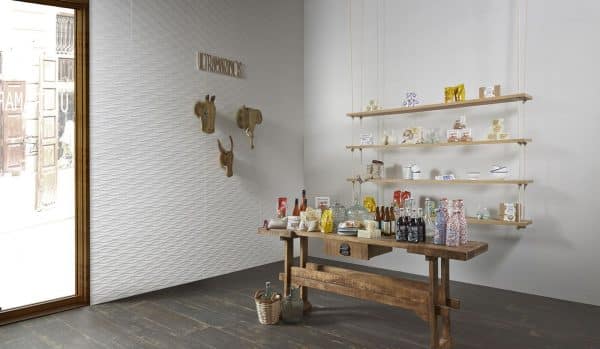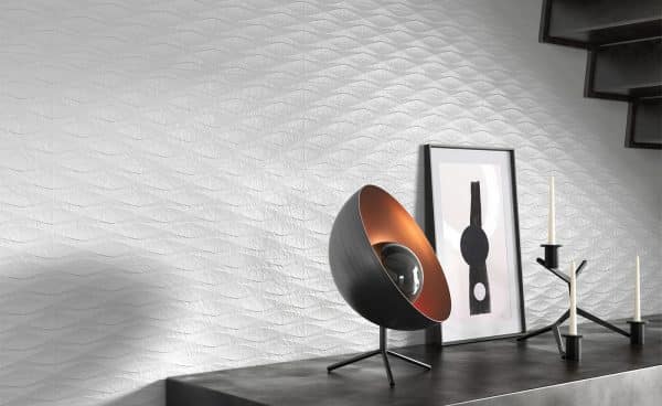 This collection is a 12×36 wall deco tile that is reminiscent of elaborate metal plates. The Blanco color has its relief pattern rubbed with a silver metallic finish and the Beige color is rubbed with a gold metallic finish.