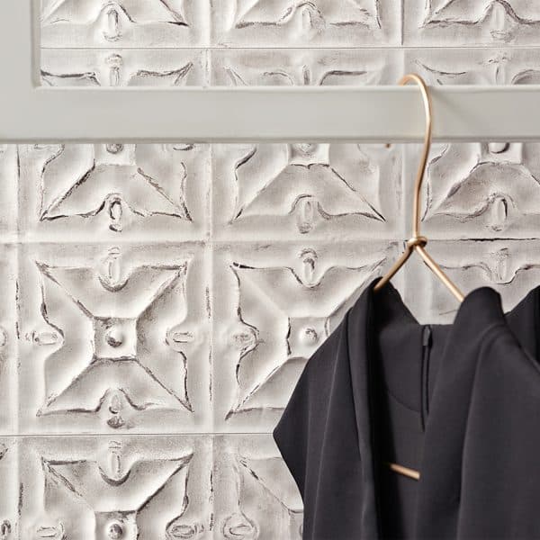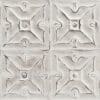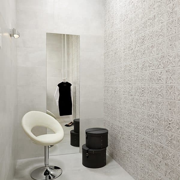 This collection is a 12×36 wall deco tile that is reminiscent of elaborate metal plates. The Blanco color has its relief pattern rubbed with a silver metallic finish and the Beige color is rubbed with a gold metallic finish.